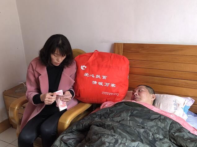 2月26日,正值2018 新春佳節(jié)之際,山東省扶貧開發(fā)基金會秘書長王景輝,洪力網(wǎng)副總經(jīng)理楊瑩,副秘書長、山東天使健康救助聯(lián)盟秘書長、山東廣播電視臺《公益山東》副制片人晁玉萍等在山東省血液中心獻(xiàn)血辦主任王淑榮的陪同下,專程從濟(jì)南趕往淄博市張店區(qū)看望和慰問因重病陷入困境的無償獻(xiàn)血者張明豹。